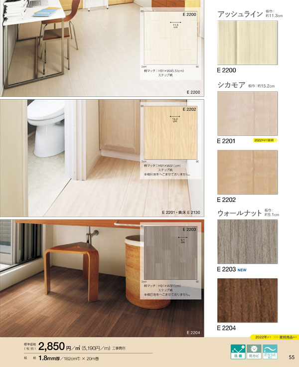 シンコールポンリューム(E2200,E2201,E2202,E2203,E2204)の販売 こちらのページではシンコール製クッションフロアのカタログ、ポンリューム2019-2020掲載ウッド・アッシュライン(E2200)シカモア(E2201,E2202)ウォールナット(E2203,E2204)がお買い上げ頂けます。