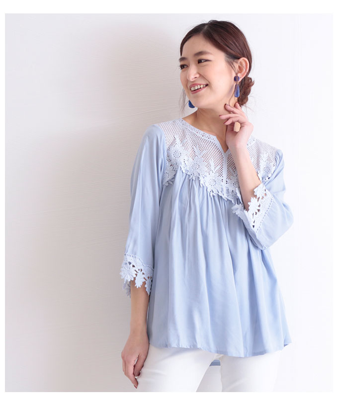 花レース透けるフレアトップス レディース ファッション トップス ブルー 7分袖 フレア キーネック 春 夏 花 レース フレア袖 袖コンシャス 30代 40代 50代 60代 サワアラモード sawaalamode otona 大人 kawaii 可愛い 洋服 かわいい服 大人可愛い