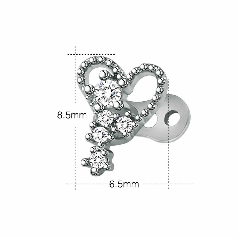 デザイン部分(ハート側)に凸のネジ山、ダーマルベース部分に凹のネジ穴のある普通のボディーピアスと逆の内ネジタイプなので、皮膚を傷つけにくいボディージュエリー。