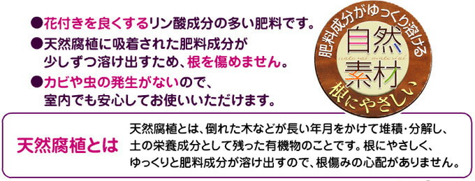 倒木など長い年月をかけて分解し、堆積した天然腐食の肥料成分がゆっくり溶け出し、根傷みの心配がありません。