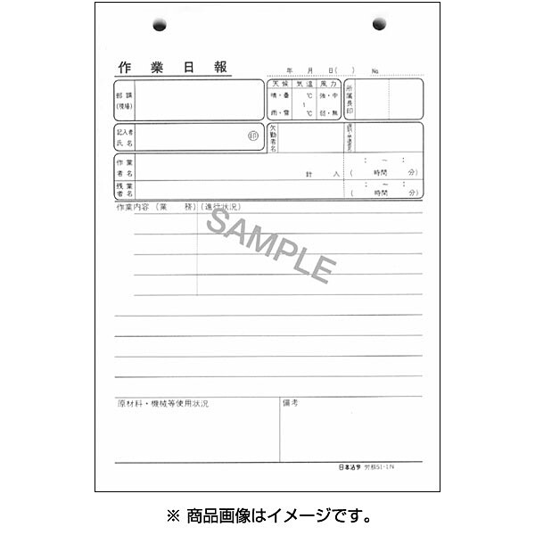 商品名日本法令 法令様式 労務 51-1N 作業日報説明●事務用箋・カーボン紙●法令様式・ビジネスフォーム●様式:ノーカーボン作業日報●仕様:ノーカーボン2枚複写●規格:B6●入数:50組●穴数:上部2穴品番ロウム 51-1Nこの商品について 必ずご確認ください配送についてメール便での配送になります。