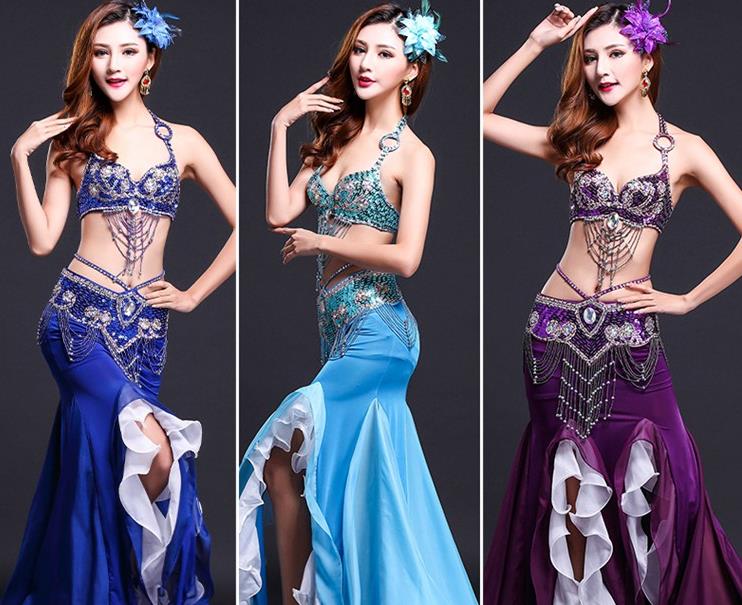 2color 社交ダンス ベリーダンス衣装 フリンジ スパンコール クラーデション レディース 上下セット+腰巻き 3点セット 舞台風 演出
