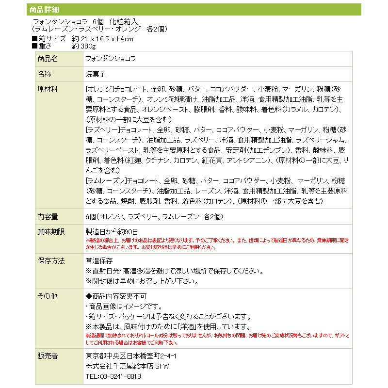 商品詳細 フォンダンショコラ 6個 化粧箱入 (ラムレーズン・ラズベリー・オレンジ 各2個) ■箱サイズ 約 21 x 16.5 x h4cm ■重さ 約 380g 商品名 フォンダンショコラ 名称 焼菓子 原材料 [オレンジ]チョコレート、全卵、砂糖、バター、ココアパウダー、小麦粉、マーガリン、粉糖(砂糖、コーンスターチ)、オレンジ砂糖漬け、油脂加工品、洋酒、食用精製加工油脂、乳等を主要原料とする食品、オレンジペースト、膨脹剤、香料、酸味料、着色料(カラメル、カロテン)、(原材料の一部に大豆を含む) [ラズベリー]チョコレート、全卵、砂糖、バター、ココアパウダー、小麦粉、マーガリン、粉糖(砂糖、コーンスターチ)、油脂加工品、ラズベリー、洋酒、食用精製加工油脂、ラズベリージャム、ラズベリーペースト、乳等を主要原料とする食品、安定剤(加工デンプン)、香料、酸味料、膨脹剤、着色料(紅麹、クチナシ、カロテン、紅花黄、アントシアニン)、(原材料の一部に大豆、りんごを含む) [ラムレーズン]チョコレート、全卵、砂糖、バター、ココアパウダー、小麦粉、 マーガリン、粉糖(砂糖、コーンスターチ)、油脂加工品、レーズン、洋酒、食用精製加工油脂、乳等を主要原料とする食品、焼酎、膨脹剤、香料、着色料(カロテン)、(原材料の一部に大豆を含む) 内容量 6個(オレンジ、ラズベリー、ラムレーズン 各2個) 賞味期限 製造日から約90日 ※製造の都合上、お届けのお品は表記より短くなります。
