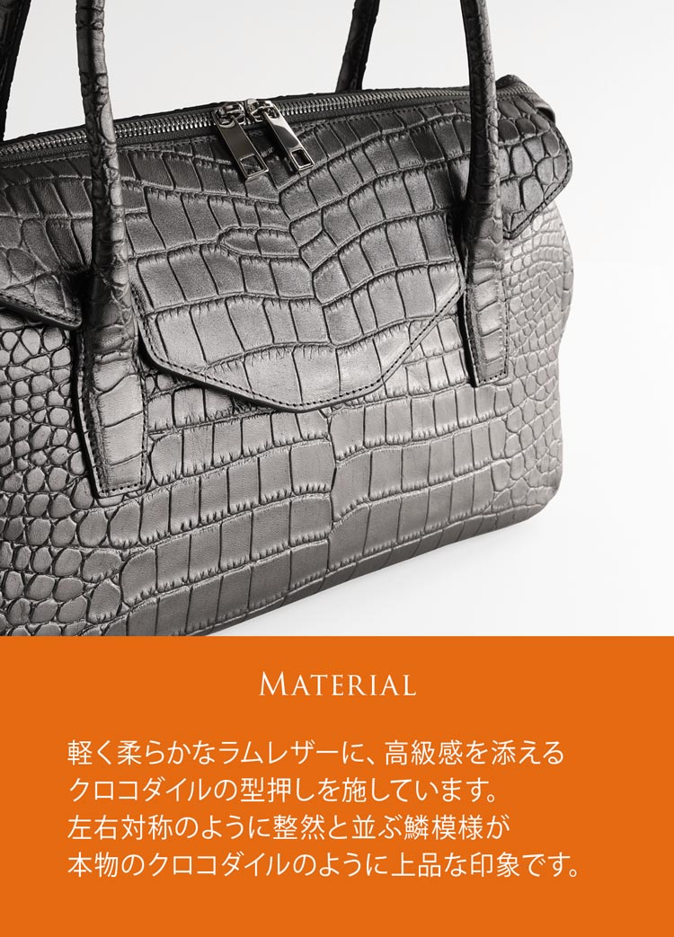 ●素材軽くて柔らかなラム革に、クロコダイルの型押しを施して使用しています。