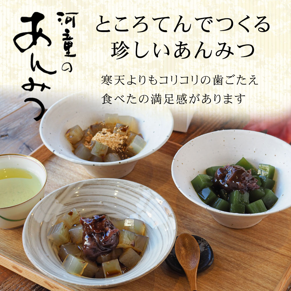 ところてんから作る伊豆河童のあんみつは、コロコリした食感が特徴です。